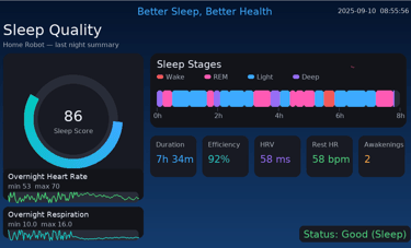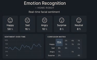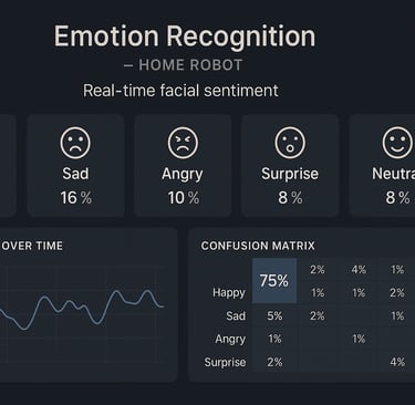 By analyzing facial expressions, the robot detects emotions such as happiness, sadness, or fatigue. It reacts with animated eye expressions and friendly voice responses to provide companionship and reassurance.
