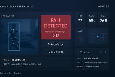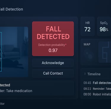 If the robot detects a fall, it first asks: “Are you okay?”. If no response is received within 30 seconds, an automatic alert is sent to family members through the app, and emergency services can be contacted if needed.